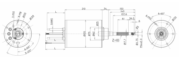 内传子电机D155L210规格(In-runner Motor D155L210 Specification) 型号 (model P/N) D155L210-95 D155L210-76 D155L210-63 D155L210-54 D155L210-48 线圈圈数 (Turn) 2T 2.5T 3T 3.5T 4T 工作电压范围 (Voltage range) 8-16S (26-67.2V) 10-20S (35-84V) 10-24S (37-100.8V) 14-28S (51.8-117.6V) 14-32S (51.8-134.4V) 最大转数 Max Spin Speed)(RPM) 6384 6384 6350 6350 6451 转速常数 kV(RPM/V) 95 76 63 54 48 转矩常数 Kt(N*M/A) 0.1088 0.1328 0.1632 0.1882 0.215 空载电流 @8.4V(Current @8.4V without Loading)(A) 5.3 4.3 3.5 3 2.7 最大输出功率( Max Power)(KW) 45 46 46 45 45 最大工作电流(Peak current)(A) 1000 800 670 580 500 最大效益(Effeciency) 89% >89% 90% 91% 91% 最大输出扭矩(max torque@60%)(N*M) 69 71 73 72 71 额定功率@效益80%(Rating Power)(KW) 26 26 26.6 26 26 额定扭力@效益80%(Rating Torque @ 80%) (N*M) 52 53 52 51 51 重量(Weight)(KG) 16.9 16.4 16.7 16.3 16.8 内部结构(Construction) 12N/10P 冷却方式(Cooling Solution) 水冷(water cooling) 外型尺寸(Demension)(mm) D155*L210 最高工作温度(Max working temperature) 120︒C 绝缘电压及漏电流(insulation voltage & leak current AC500V/10MA/3S 伸出轴规格(shaft extension )(mm) D25*L50 伸出线长(Lead wires extension) 2AWGx300mm 连接插头(Plug) 10.0mm plug 使用寿命(life Span) 8000H 关键词:- d155l210